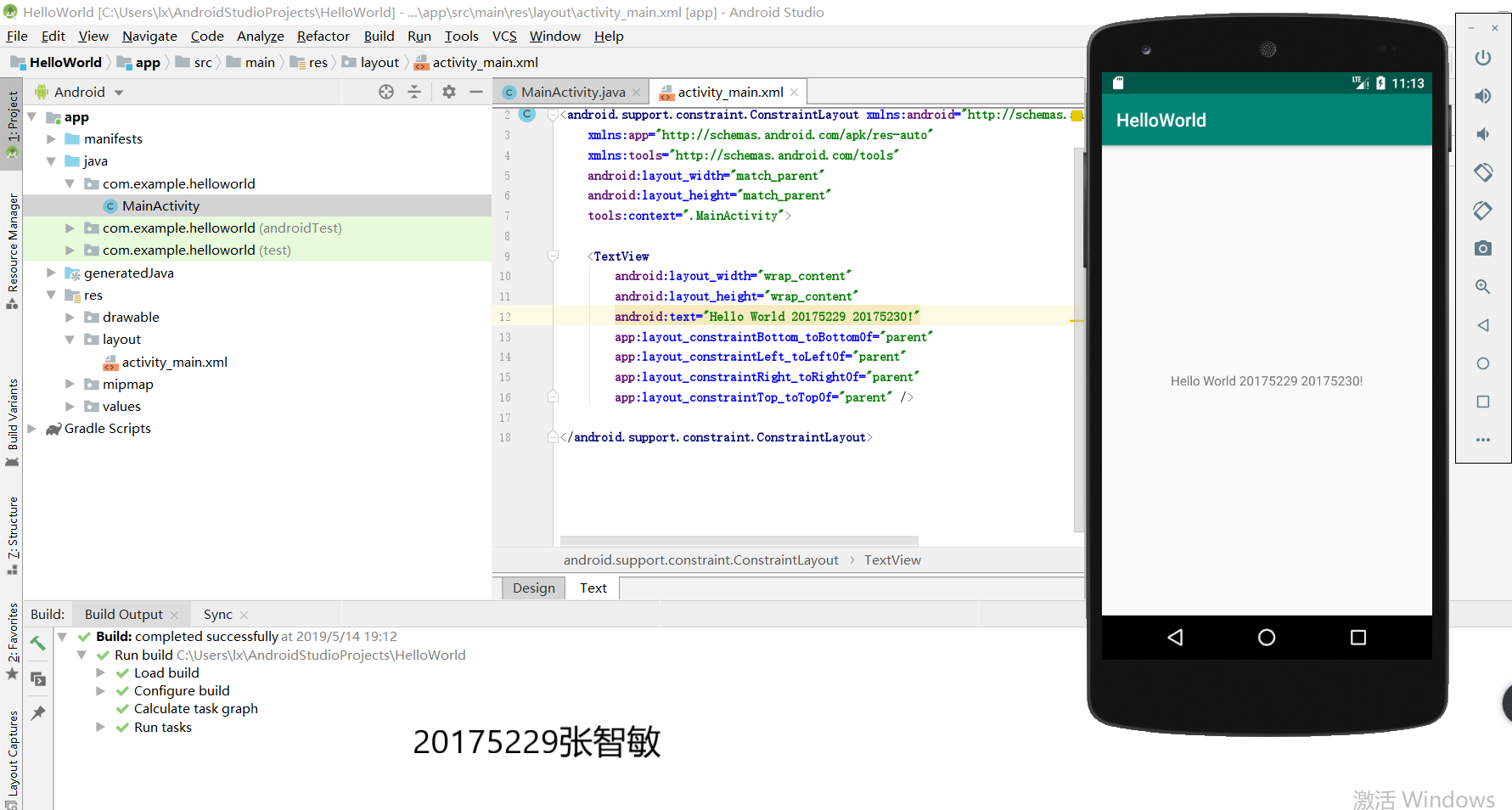 #一、实验四 Android程序设计-1 1.实验要求: Android Stuidio的安装测试: 参考《Java和Android开发学习指南(第二版)(EPUBIT,Java for Android 2nd)》第二十四章: (1) 参考http://www.cnblogs.com/rocedu/p/6371315.html#SECANDROID,安装 Android Stuidio; (2) 完成Hello World, 要求修改res目录中的内容,Hello World后要显示自己的学号,自己学号前后一名同学的学号,提交代码运行截图和码云Git链接,截图没有学号要扣分; (3)学习Android Stuidio调试应用程序。