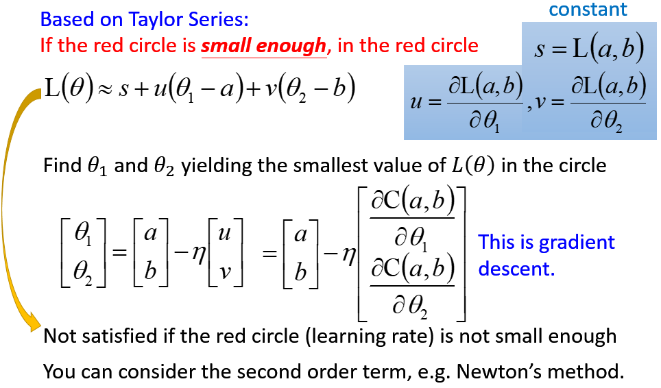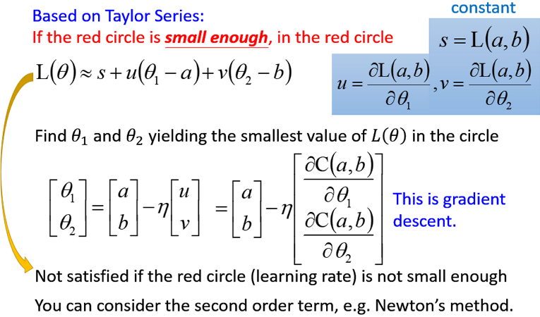如果$h(x)在x=x_0$ 点的某个领域内有无限阶导数,则有泰勒级数: $$ \begin{split} h(x)&=\sum^\infty_{k=0}\frac{h^k(x_0)}{k!}(x-x_0)^k\ &=h(x_0)+h'(x_0)(x-x_0)+\frac{h''(x_0)}{!}(x-x_0)^2+... \end{split} $$ 二元泰勒: $$ h(x,y)=h(x_0,y_0)+\frac{\partial h(x_0,y_0)}{\partial x}(x-x_0)+\frac{\partial h(x_0,y_0)}{\partial y}(y-y_0)+... $$