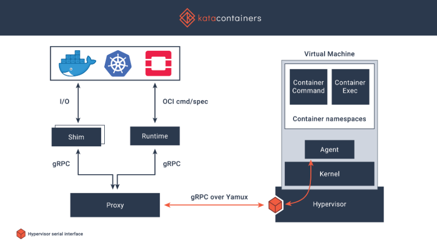 Kata Containers is Apache 2 licensed software consisting of six components: Agent, Runtime, Proxy, Shim, Kernel and packaging of QEMU 2.11. It is designed to be architecture agnostic, run on multiple hypervisors and plug seamlessly into the containers ecosystem.
