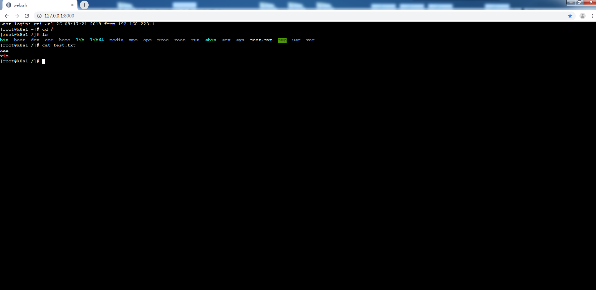 基于 python3.7 + django 2.2.3 实现的 django-webshell,支持颜色显示,支持 tab 命令补全,项目地址:https://github.com/leffss/django-webssh。 参考项目。在参考项目的基础上做了一些优化:新增前端页面刷新确认页面(刷新会导致 websocket 连接断开)、后端 paramiko 线程创建代码优化、记录命令记录以及结果。有兴趣的同学可以在此基础上稍作修改集成到自己的堡垒机中。