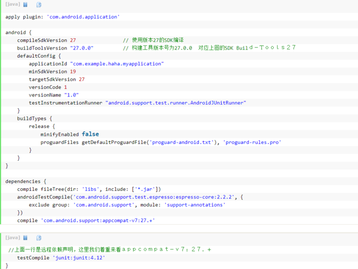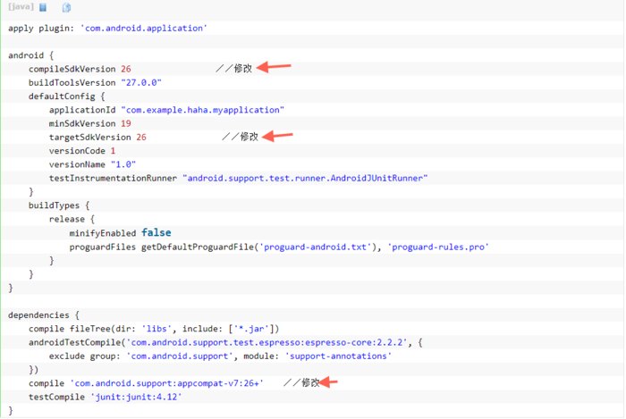 上面我们查到我们的sdk工具版本是26,这里的远程依赖包的版本是27,那么我们只需要将把版本减低到和sdk工具版本相同就ok啦