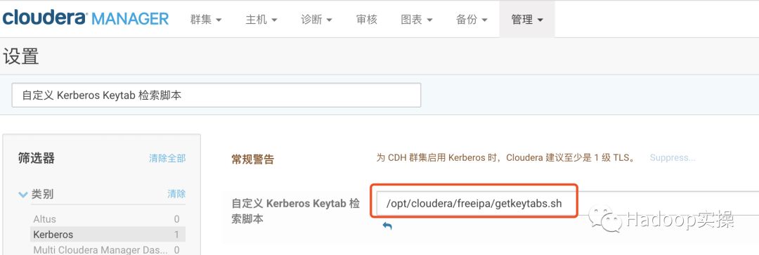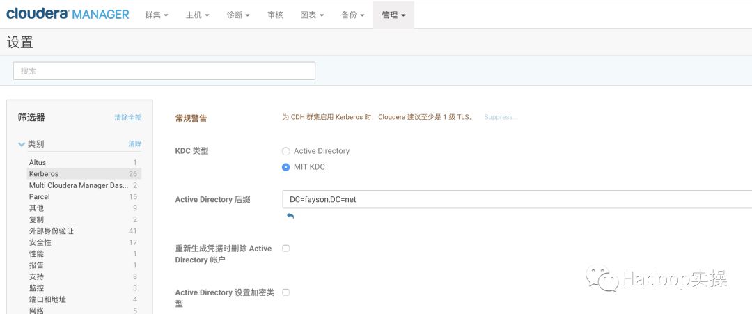 2.进入“管理”->“设置”界面,通过过滤类别筛选Kerberos相关配置