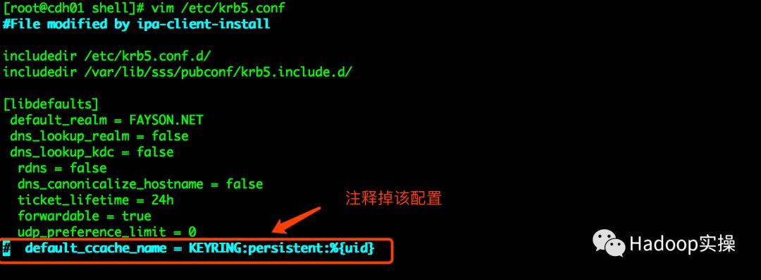 7.特别注意需要将FreeIPA默认的krb5.conf配置文件中default_ccache_name = KEYRING:persistent:%{uid}参数注释掉,否则会导致无法访问HDFS服务提交作业等。