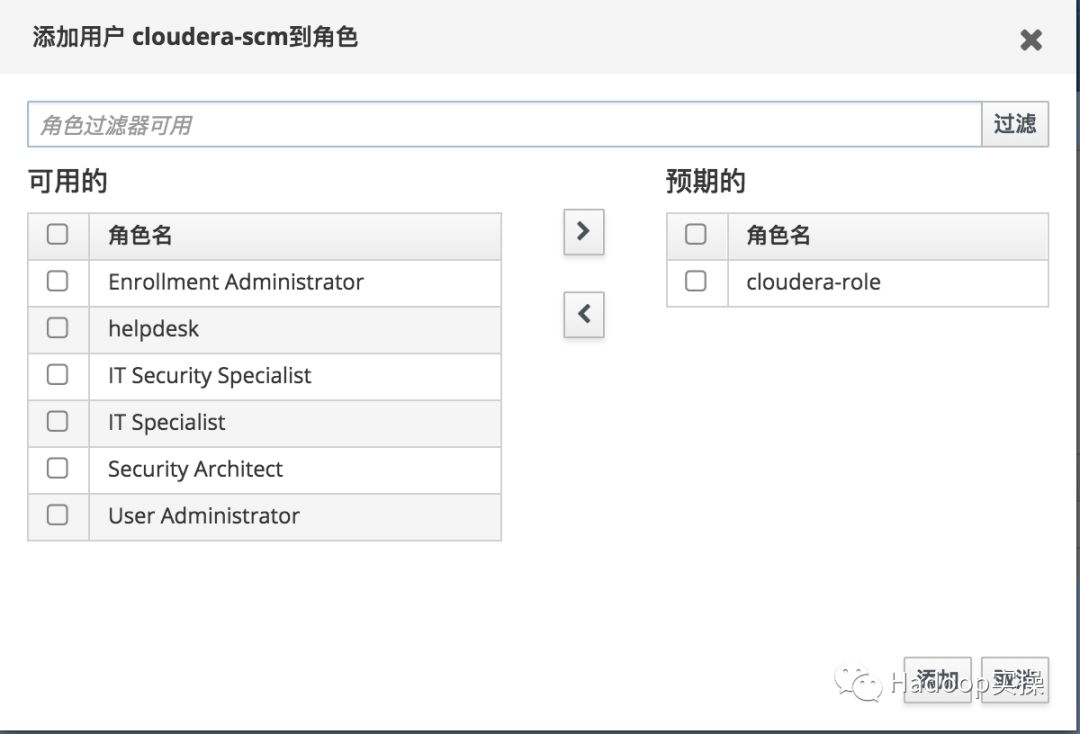 点击“角色”菜单,为cloudera-scm用户添加角色