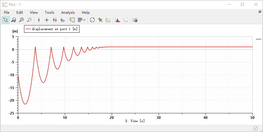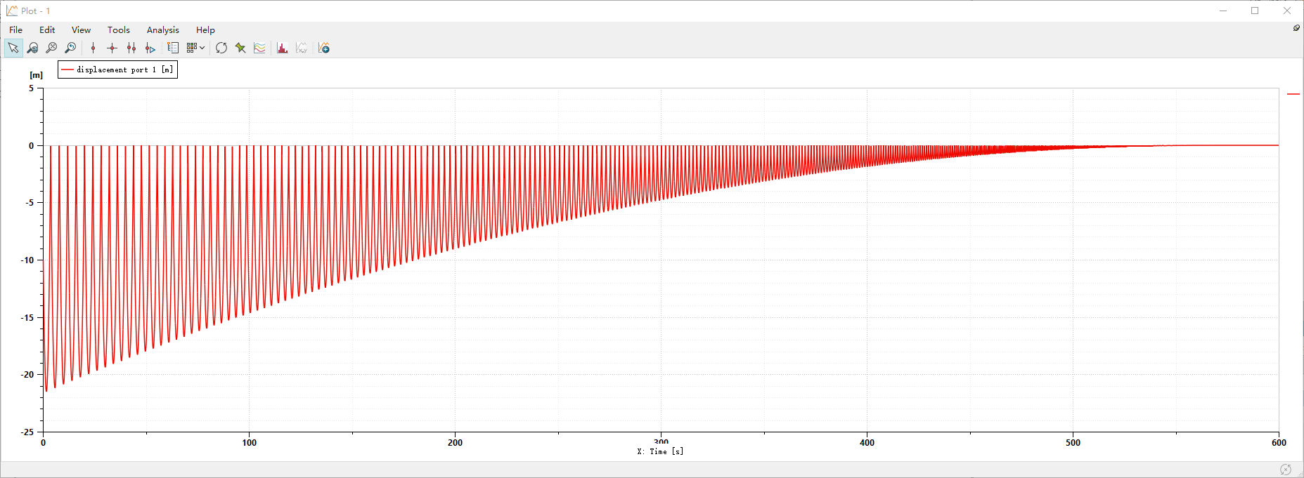 选择小球位置信号,拖出来看,果然小球弹了好久才完全落地,接近550s。。。。(注意这里小球位置为负数,因为是参照质量块的运动方向来的)