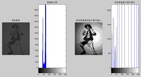 subplot(1,4,4),imhist(histeq(img)), title('降低亮度直方图均衡化');