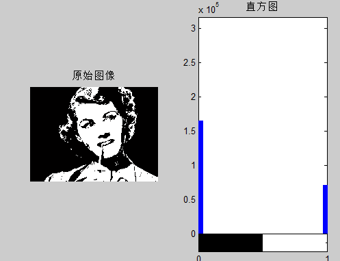 把图片转换为二值化图像,直方图如下。灰度只有0和1,符合二值化图的特点。