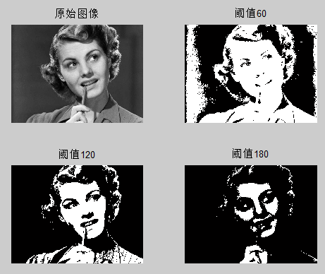 subplot(2,2,2),imshow(img1),title('阈值60');