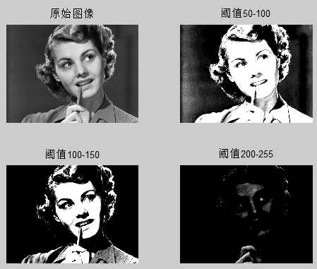 subplot(2,2,3),imshow(img, [100, 150]),title('阈值100-150');