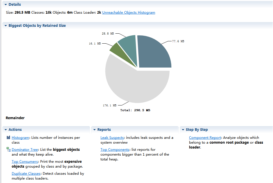 - Leak Suspects:这个是最常用的,会自动检测分析内存异常的原因