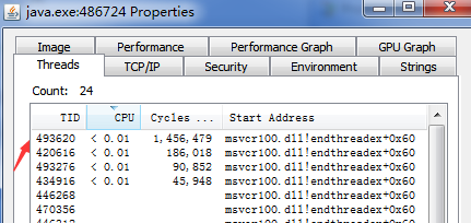 5、然后右键-->Properties,再选择Threads选项卡,点进CPU排序,可以找到消耗CPU最多的那个线程的十进制线程ID