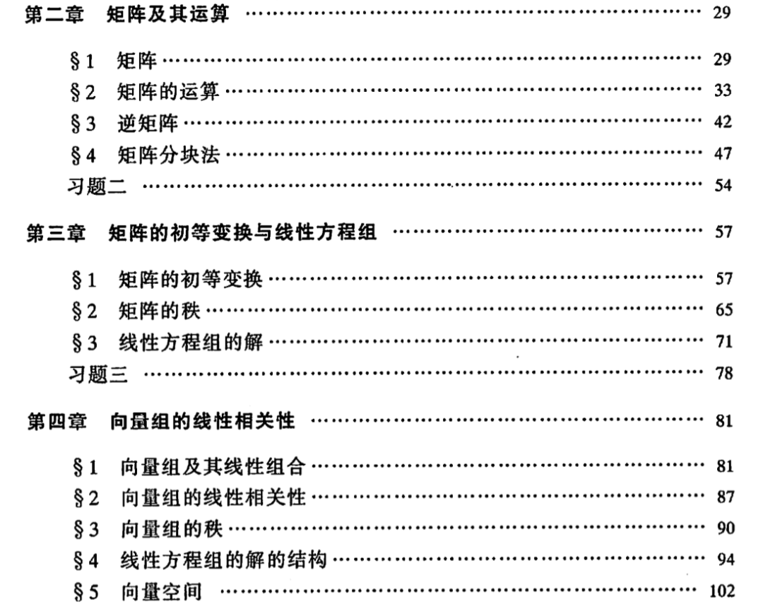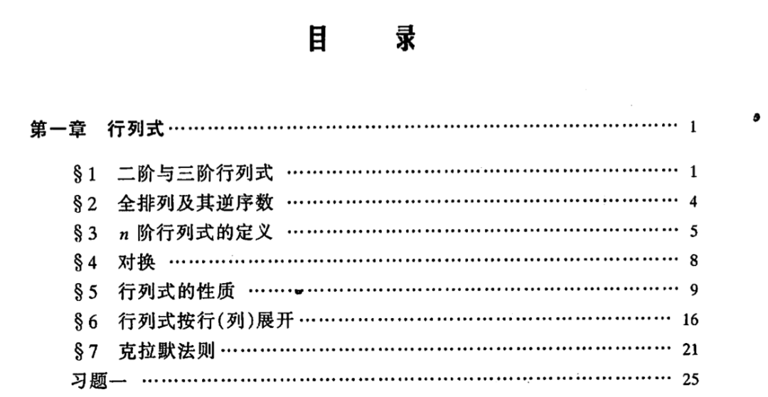 在第一章讲完行列式之后,该书随后介绍了矩阵及其运算、矩阵的初等变换与线性方程组、向量组的线性相关性、相似矩阵及二次型、线性空间与线性变换几个章节。