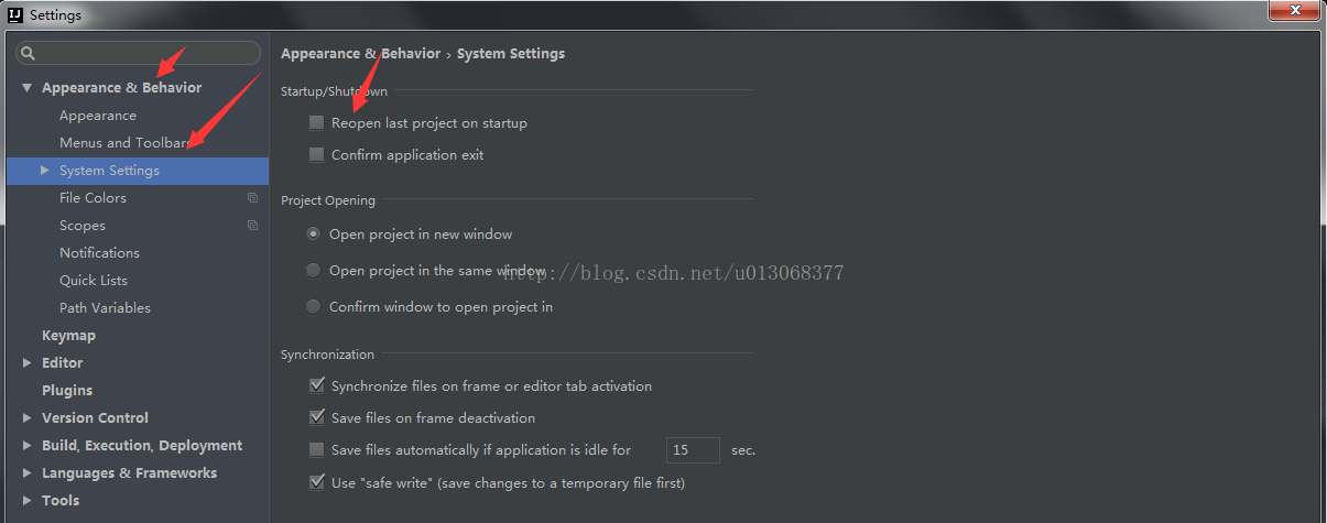 Settings -> Appearance&Behavior -> System Settings标签项里