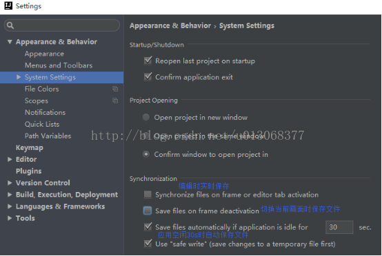 同时我们选择"Save files automatically", 并将其设置为30秒,这样IDEA依然可以自动保存文件,也就是在30s内不会帮你自动保存文件,需要手动ctrl+s保存,超过30s会自动帮你保存。