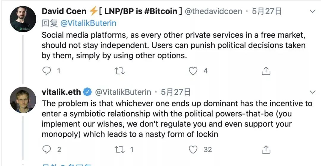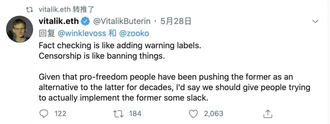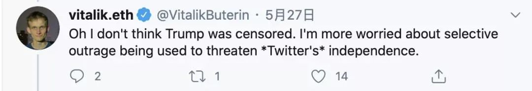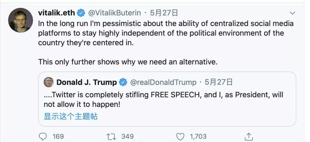 26 日,推特为川普推文加注“事实核查”标签之后,川普批评推特“扼杀言论自由”,Vitalik 对此评论说,“从长远来看,我对中心化社交媒体平台保持高度独立的能力感到悲观。这仅进一步说明了我们为什么需要替代方案。”