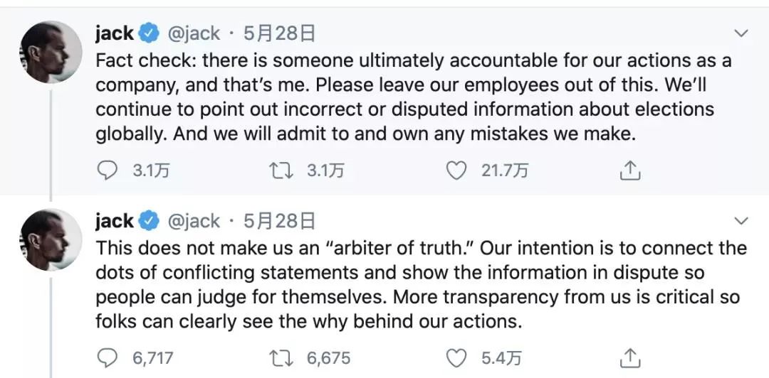 “事实核查:如果最终有人对我们作为一家公司的行为负责,那就是我。请不要针对我们的员工。我们将继续指出有关全球选举的不正确或有争议的信息。我们将承认并承担我们犯的任何错误。”