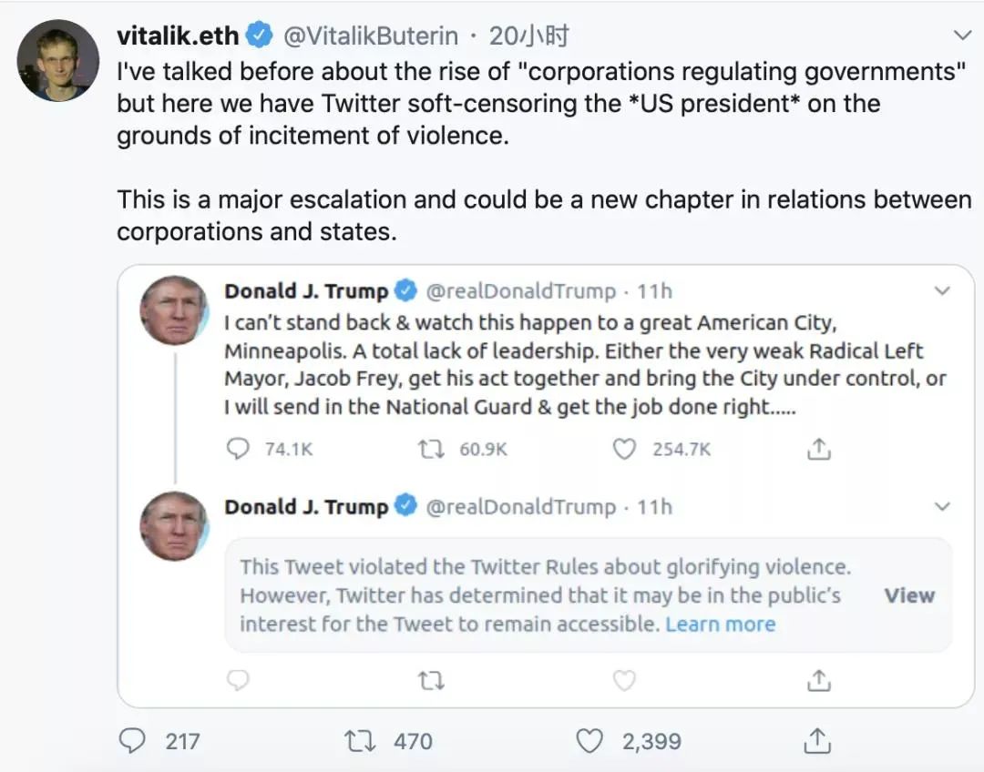 5 月 29 日,川普的推文“当抢劫开始时,射击就开始了”被推特定义为“美化暴力”,进而被隐藏。Vitalik 截取了川普推文被隐藏的截图并评论说: