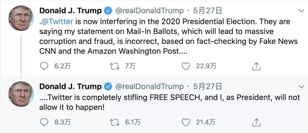 在被推特官方加注“事实核查”标签几分钟之后,川普的报复就来了。川普再次发文指责推特“干预 2020 年总统大选”。他指责推特根据“假新闻”CNN 和华盛顿邮报的所谓事实进行的核查。”川普接着还声称,推特这个平台“完全扼杀了言论自由”,并且誓言作为总统,他不会允许这样的事情发生。