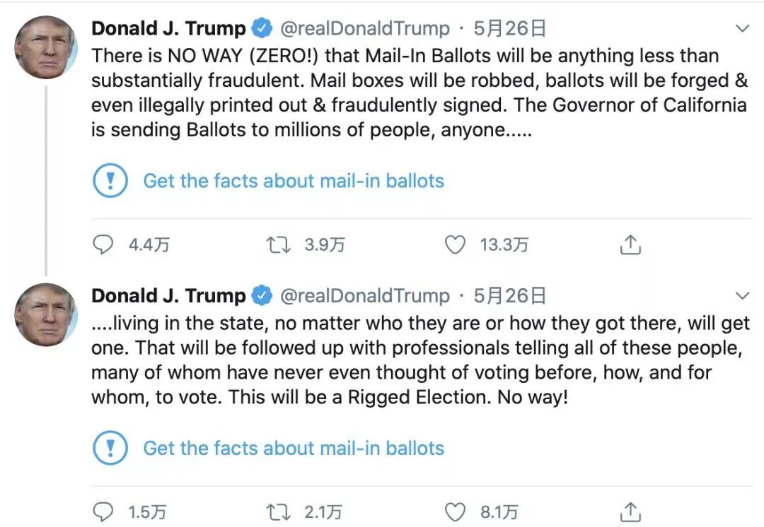 5 月 26 日,川普发布推文声称,邮寄选票“实质上是欺诈”,将导致“选举被操纵”。