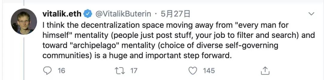 “我认为,去中心化领域从“每个人都为自己”的心态(人们只是发布内容,过滤和搜索您的工作)到“ archipelago(群岛)”的心态(多样化的自治社区的选择)是一个巨大而重要的进步 。”