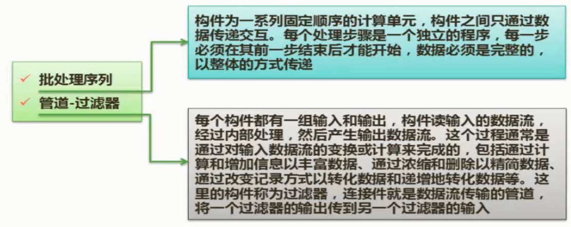 在管道/过滤器风格中,每个构件都有一组输入和输出,构件读输入的数据流,经过内部处理,