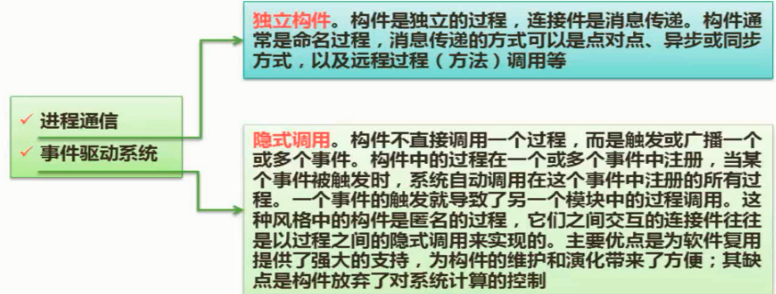 基于事件的隐式调用风格的思想是构件不直接调用一个过程,而是触发或广播一个或多个事件。系统中的其它构件中的过程在一个或多个事件中注册,当一个事件被触发,系统自动调用在这个事件中注册的所有过程,这样,一个事件的触发就导致了另一模块中的过程的调用。