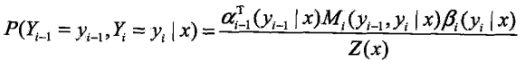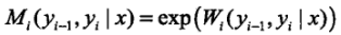 首先对标记序列引入特殊的起点和终点的标记y0 = start,yn+1 = stop(该引进主要是为了让y1和yn能和其他的点以同样的形式表述)。引入一个m × m的矩阵M(x的每一个位置i = 1, 2, ..., n+1上都有这样一个矩阵),m为y所有可能的状态的取值个数。则M的定义如下