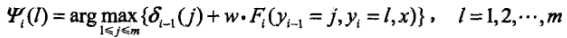 求出对应于位置i的各个标记l = 1, 2, ..., m的非规范化概率的最大值(该值的结果是依赖于之前的所有位置的,并且用于计算的值都是之前求好的,动态规划思想),同时记录非规范化概率最大值的路径