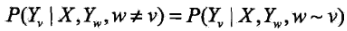 对于上面的式子若是对所有的v都成立,则称条件概率分布P(Y|X)为条件随机场。式子中w~v表示与结点v有边连接的所有结点(也就是和结点v存在依赖关系的结点),而w≠v,则表示除了v之外的所有结点。对于一般的条件随机场来说,结点v的条件概率除了和X有关还和与之有边相连的结点有关。