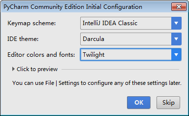 这里是选择IDE编辑界面皮肤的,一般来说使用黑底灰字看起来没那么刺眼,对眼好一点,这里选择以后还可以在里面设置。