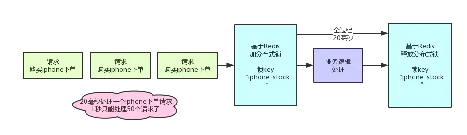 假设加锁之后,释放锁之前,查库存 -> 创建订单 -> 扣减库存,这个过程性能很高吧,算他全过程20毫秒,这应该不错了。