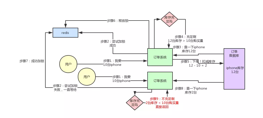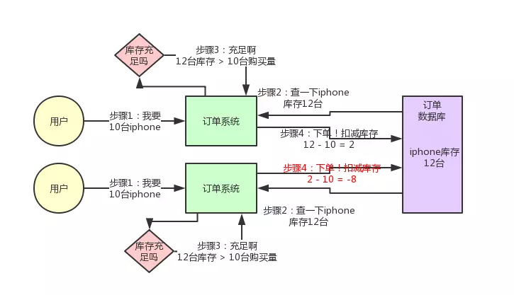 这个图,其实很清晰了,假设订单系统部署两台机器上,不同的用户都要同时买10台iphone,分别发了一个请求给订单系统。