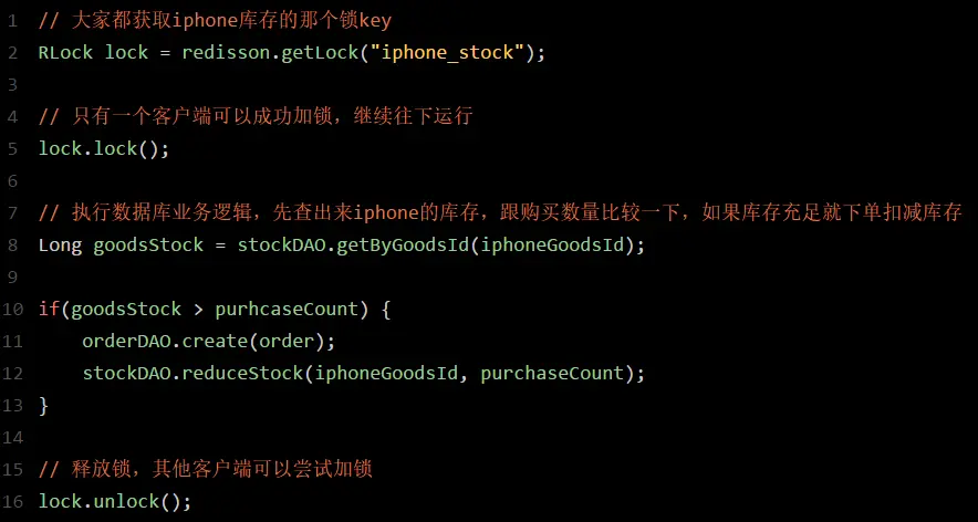 比如,对iphone这个商品的下单,都必对“iphone_stock”这个锁key来加锁。这样会导致对同一个商品的下单请求,就必须串行化,一个接一个的处理。