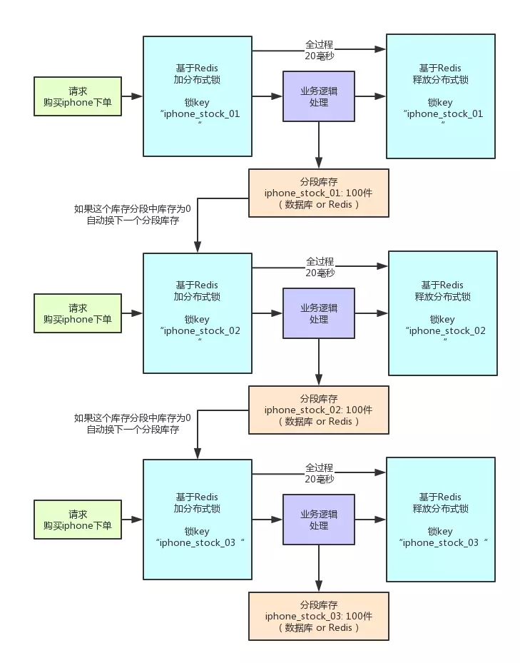其实这就是分段加锁。你想,假如你现在iphone有1000个库存,那么你完全可以给拆成20个库存段,要是你愿意,可以在数据库的表里建20个库存字段,比如stock_01,stock_02,类似这样的,也可以在redis之类的地方放20个库存key。