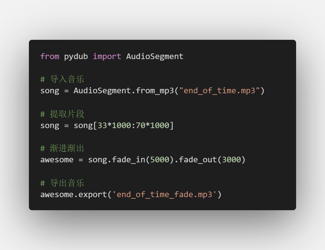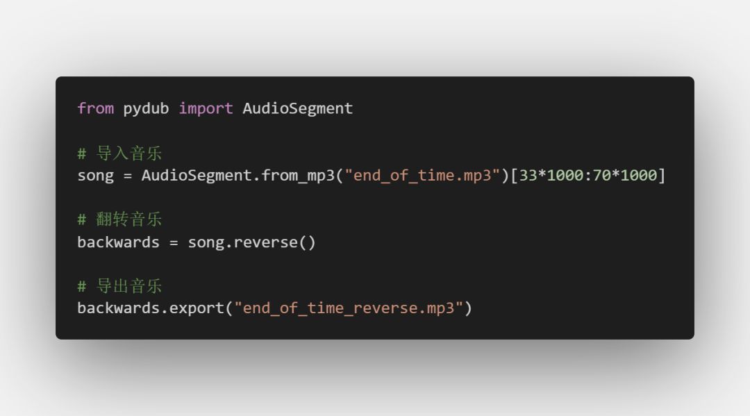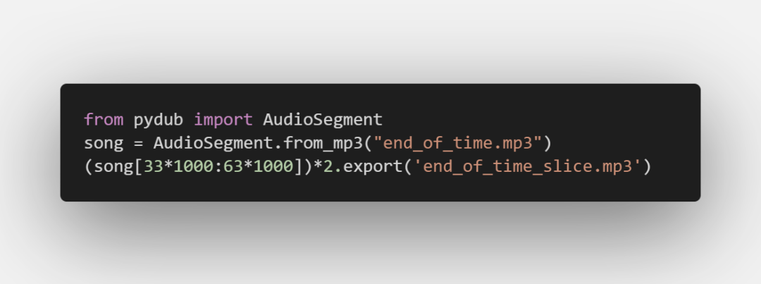 由于微信公众号只允许放三个音频,因此这个例子大家可以阅读原文进行聆听。没错,在pydub中,片段和数量之间的运算里加法调音量,乘法调长度,你记住了吗?