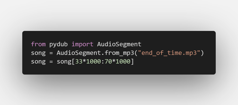你没看错,Python剪辑音乐,只需要3行语句就能瞬间完成,比如我要剪辑33秒到1分10秒的音乐片段: