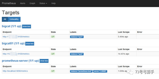 通过如下URL可以打开prometheus的自带监控界面: IP:9090,点击targets 跳转到监控目标,这里展现了多个监控对象。