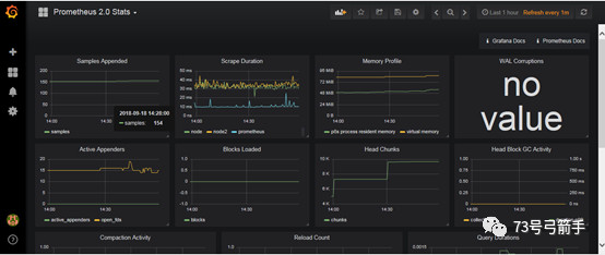 进去后会要求修改密码,然后点击add datasource,选中 Prometheus 2.0 Stats后,就可以呈现如下的监控面板了: