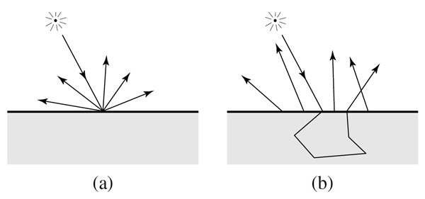 即光从表面进入物体经过内部散射,然后又通过物体表面的其他顶点出射的光线传递过程。