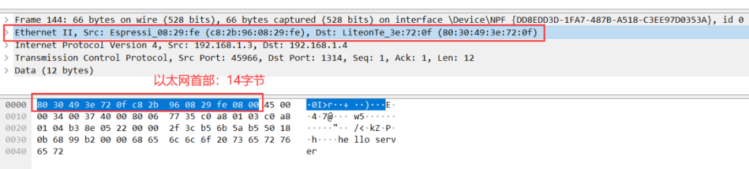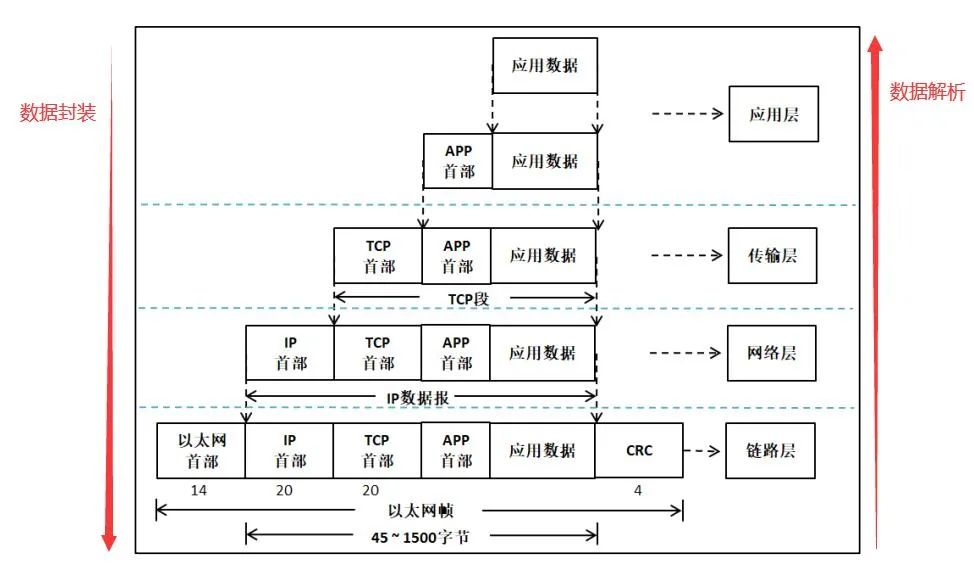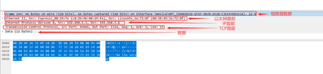 从图中我们可以看到,从上到下看,各层数据是添加该层头部信息组成新的数据包,从下到上相反。我们来看我们抓到的数据包:
