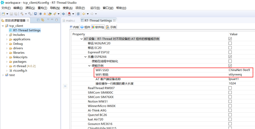 其中tcp_client为RT-Thread Studio工程,使用RT-Thread Studio工具导入之后,修改WiFi信息与你电脑连接的WiFi一致: