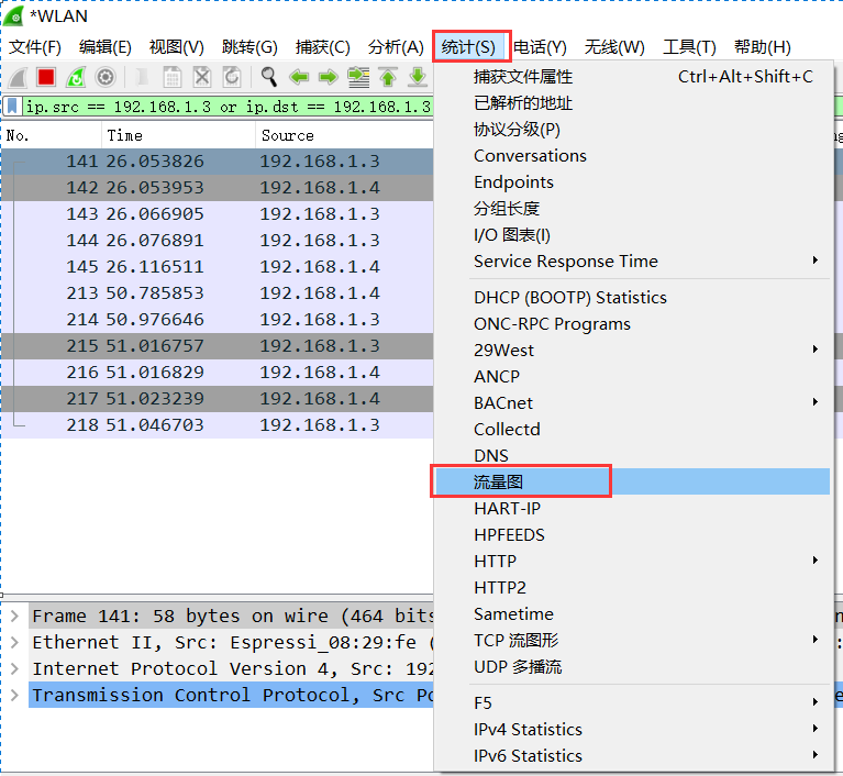 我们先来看这11个数据包是怎么划分的。打开Wireshark抓包工具的统计->流量图:
