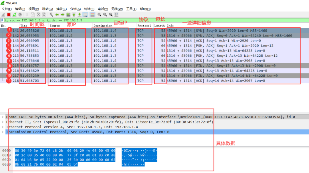这样就可以只保留这个IP收发数据,如果不设置过滤信息则显示出来的分组太多了,不便于我们进行分析。
