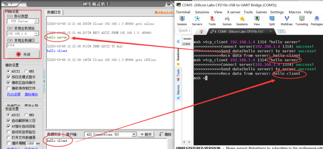 启动小熊派开发板串口终端及网络调试助手,然后互相发送数据: