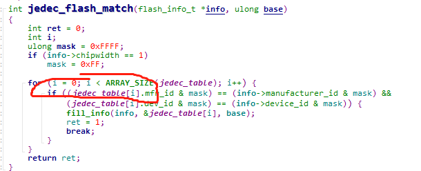 该函数会进入到 jedec_flash_match(位于drivers/mtd/jedec_flash.c文件中) 函数,打开该文件,定位到jedec_flash_match 函数: