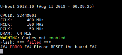 注释掉 jz2440.h 中定义的 DEBUG 宏,然后编译,烧写到 nor flash,出现如下图所示错误: