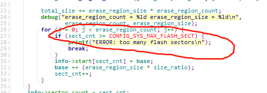 显然是宏 CONFIG_SYS_MAX_FLASH_SECT 小于我们的扇区数量,才会打印这个错误,修改 CONFIG_SYS_MAX_FLASH_SECT (位于 include/configs/jz2440.h 中):