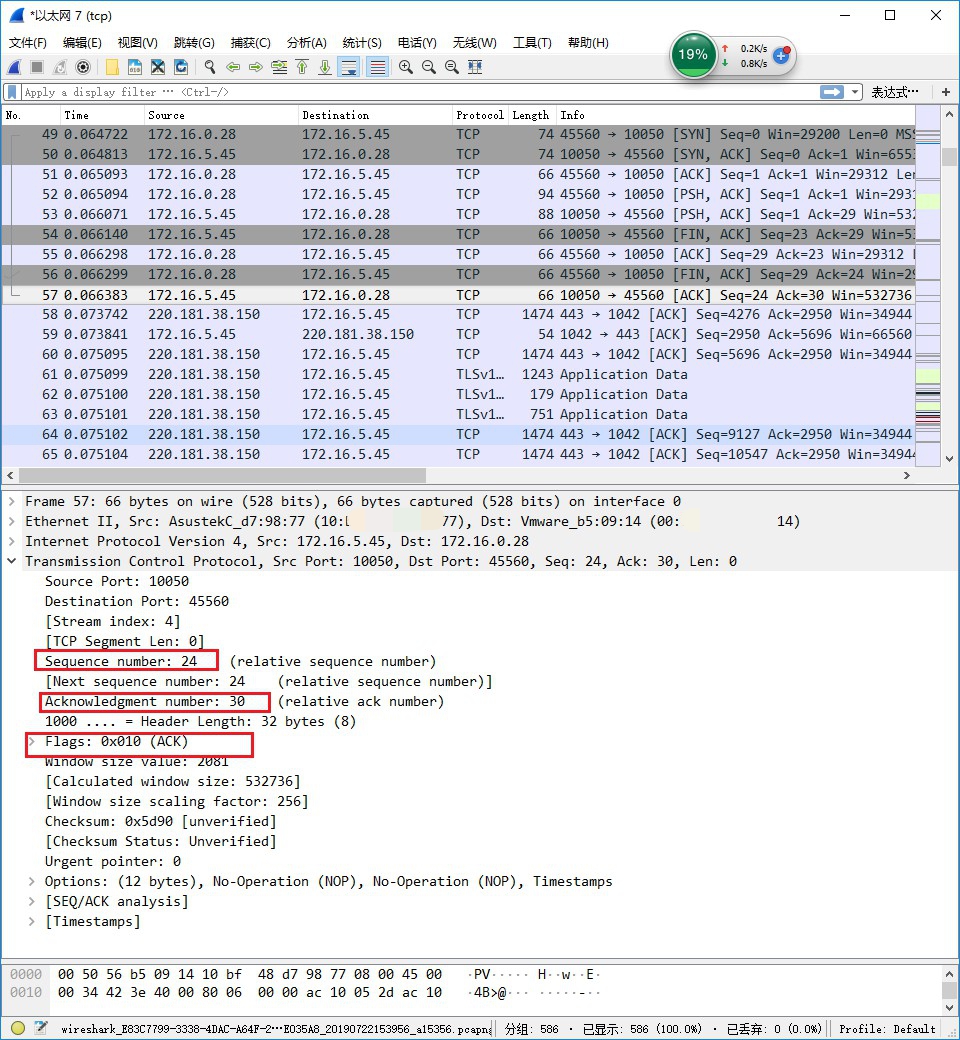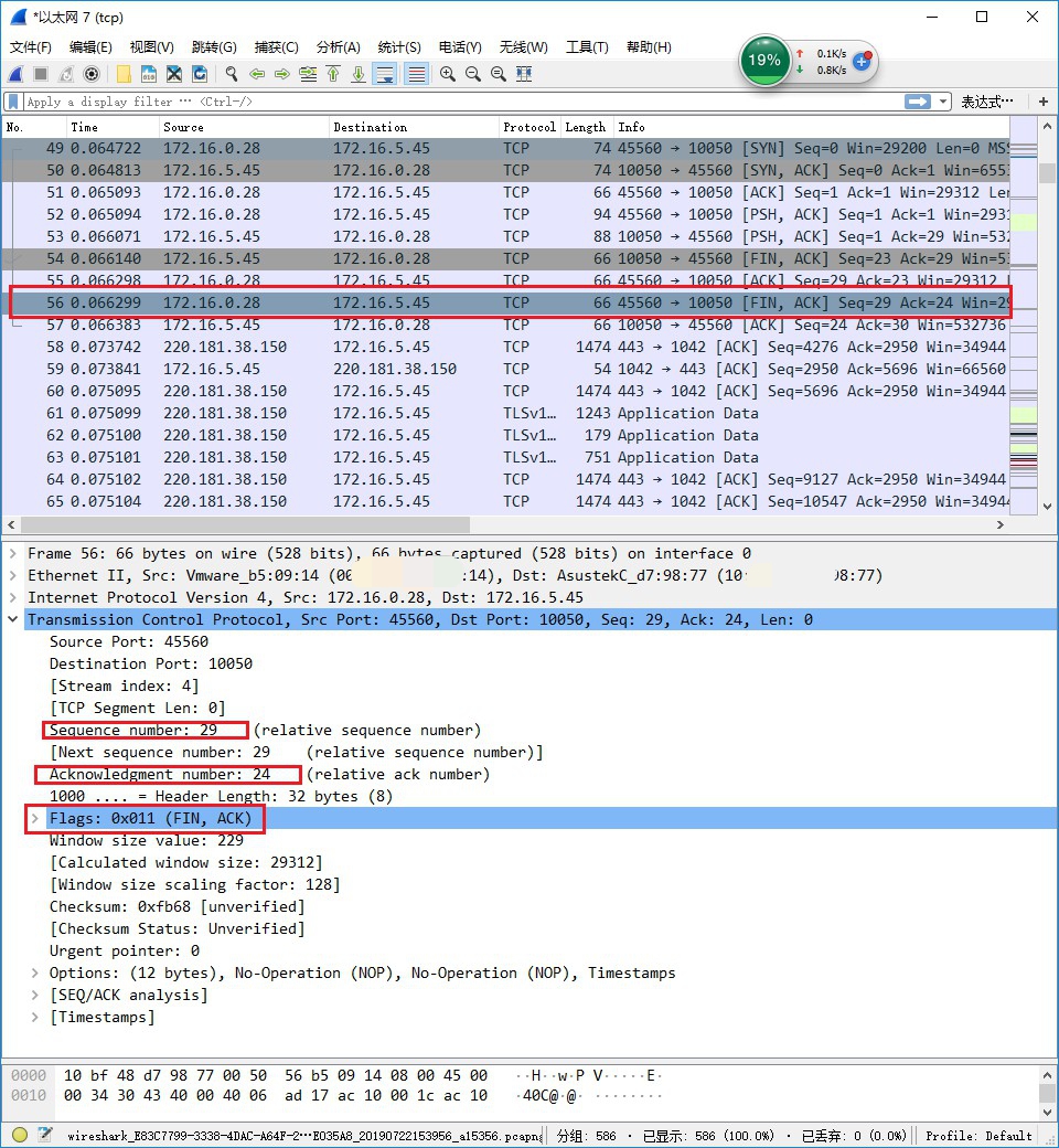 已经捕获到的封包,有源地址/目标地址,端口;颜色的不同代表不同的
