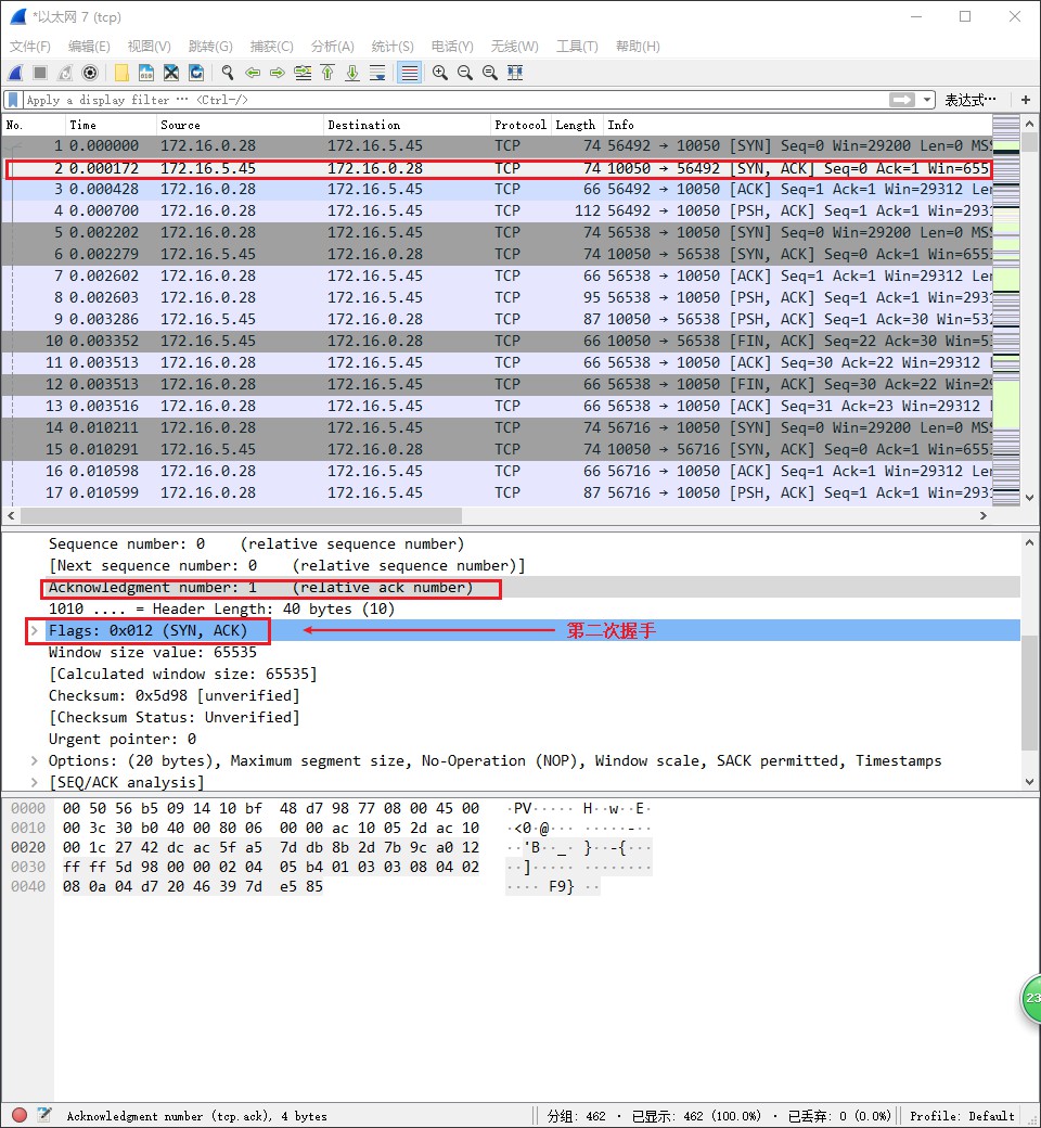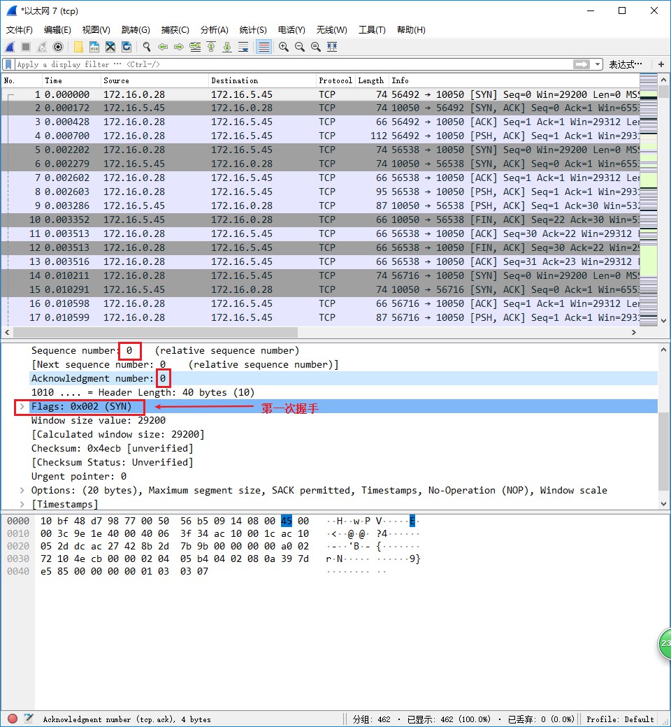 tcp.flags.syn==0x02 显示包含syn标志位的数据包