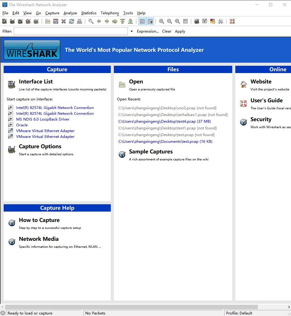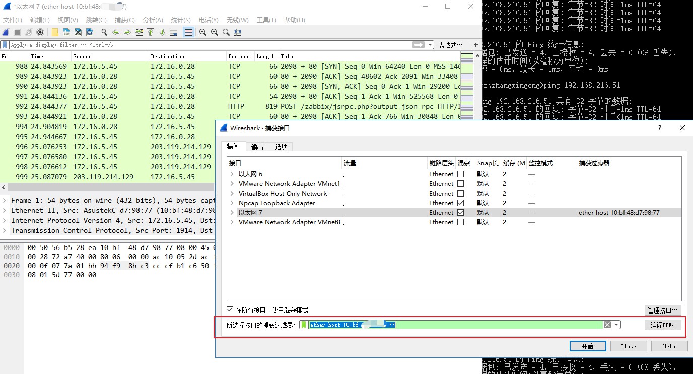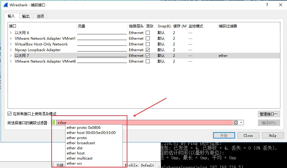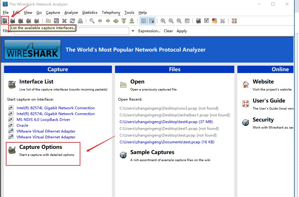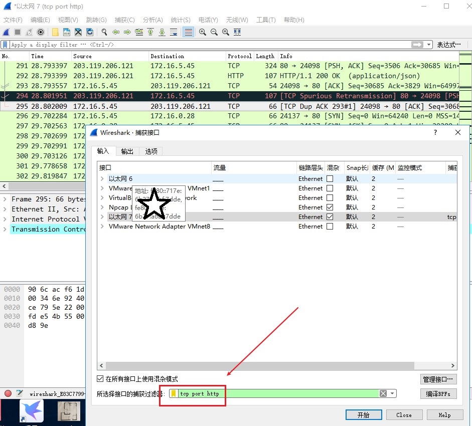 点击captrue options图标》弹出网卡如多网卡指定抓包网卡》开始抓包